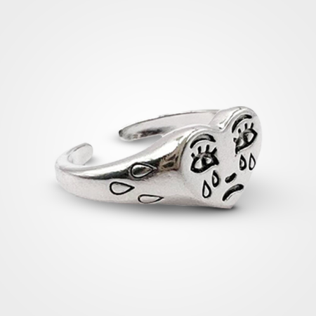 Inel reglabil în formă de inimă tristă cu lacrimi, culoare argintie.
