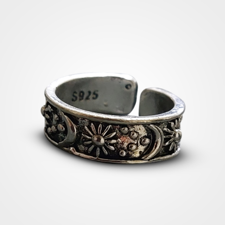 Realizat într-un stil clasic și cu o finisare argintie antică, acest inel adaugă un aer elegant și misterios oricărei ținute.